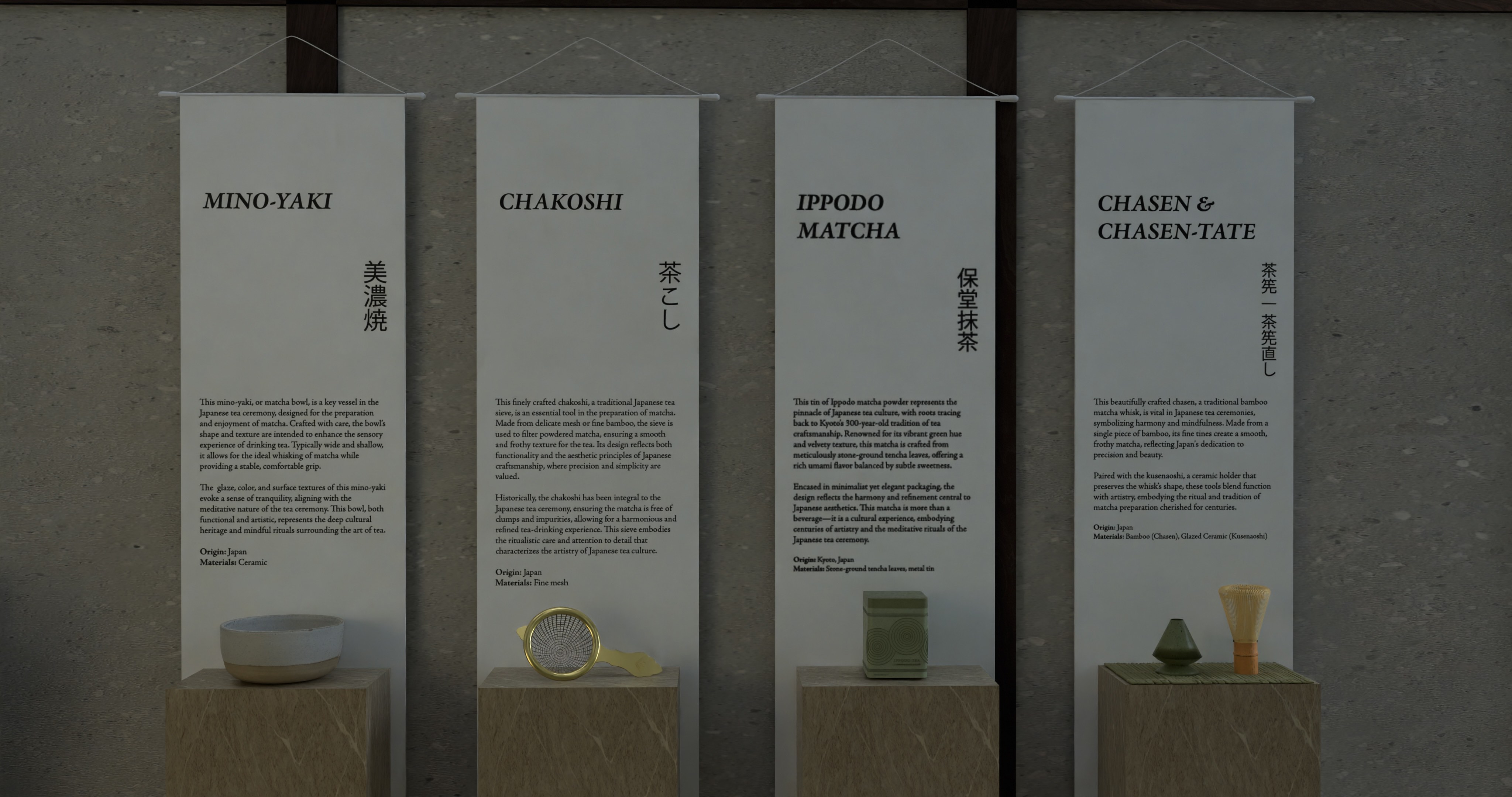 Soft, ambient signage along the walls displays the brand name alongside the Enso circle—a symbol of mindfulness and simplicity. Here, guests are welcomed by a tea master, who performs the ritual of preparing matcha with precision and care. Each guest is then served a freshly whisked bowl, inviting them to fully experience the calming and intentional art of matcha. This final space serves as a meditative pause. By inviting guests to slow down, observe, and engage with the mindful preparation of matcha, the tea room becomes more than just a destination. It becomes an experience of presence, harmony, and quiet appreciation.